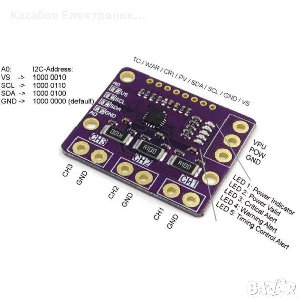 3-канален модул за измерване на напрежение и ток INA3221. Може да измерва всеки канал, захранван от шината на модула, за напрежение до 26V с точност от +/- 80uV. Платката има 5 светодиода, индикиращи състоянието, включително 2 светодиода за аларма, предупреждаващи за критични нива на някоя от измерваните стойности. Може да задава 4 различни адреса чрез запояване на джъмпери и комуникира чрез I2C шината.