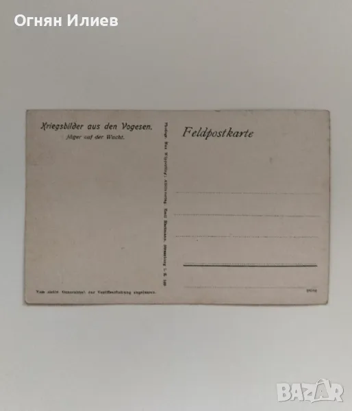 Стара германска, военна, пощенска картичка от Първата световна война (1915г.) с военна снимка от Вогези (,,Kriegsbilder aus den Vogesen."), изобразяваща войници на стража (,,Jäger auf der Wacht.").