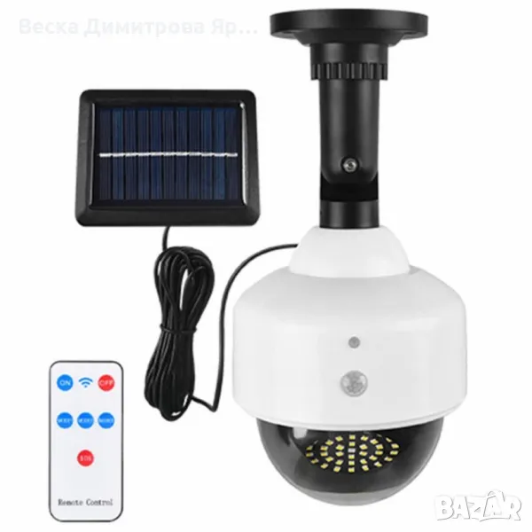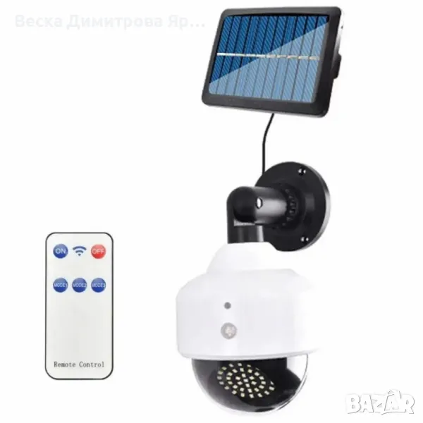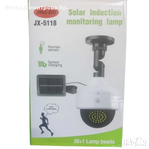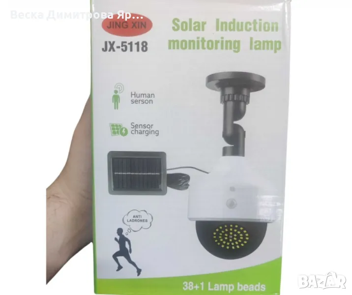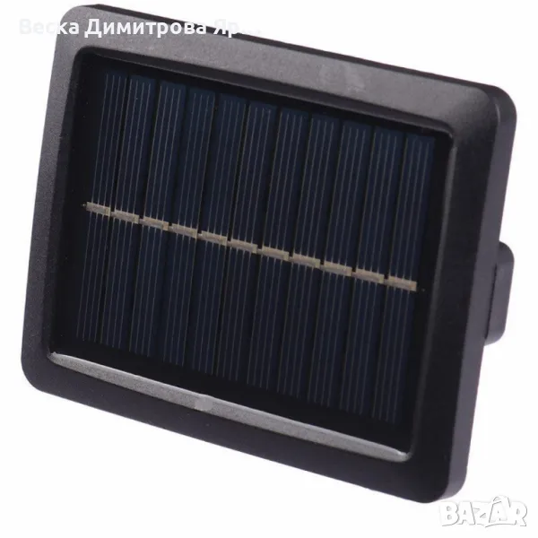 Сензор за движение, сензор за околна светлина, може да се върти на 360 градуса;Водоустойчивост: IP65;Елементи, включени в комплекта: Винтове, дюбели, основа, дистанционно управление и кабел за зареждане с игла, стенна лампа, соларен панел, дистанционно управление;Подходящи за дворове, вили, места без ток, градини и др.;Материал: ABS пластмаса с 38 SMD LED лампи с експозиция на лунна светлина;Соларен панел, с включено дистанционно управление и USB захранващ кабел;Разполага с 38 LED лампи, с номинална мощност 5 вата и напрежение 2,4 волта;Скоростта на зареждане на батерията е приблизително 8 до 10 часа в режим на слаба светлина;Има три режима на експозиция, силна, средна и ниска с цвят на лунна светлина;Захранване чрез вътрешна 1200 mAh батерия;Гаранция: 12 месеца.