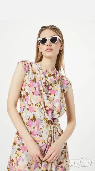 Леко падаща, 100% копринена, флорална рокля, с цип на гърба, със скосени ръкави, връзка, която позволява регулиране в талията, съвсем нова.