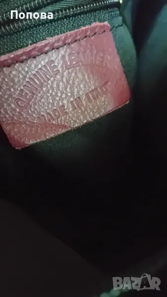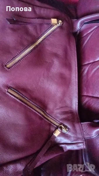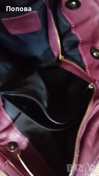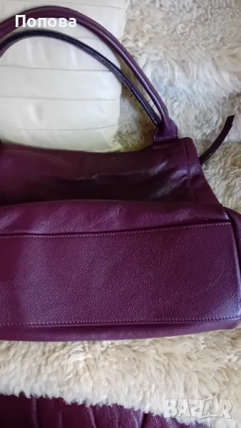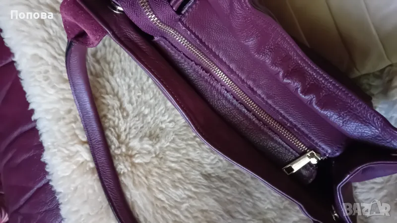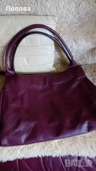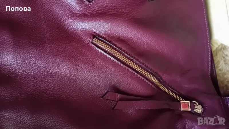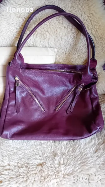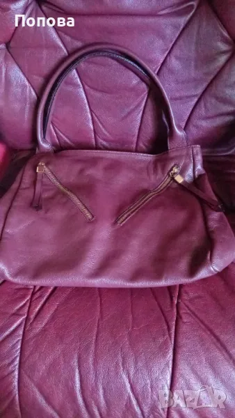 Мека естествена кожа във винено червен цвят.Дълги дръжки -53 см. ,удобни за носене на рамо.Размери 40 см. на 30 см.,дъно 10 см..Два външни джоба,едно отделение разделено на 2 от изцеление с цип.