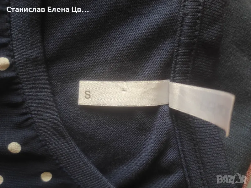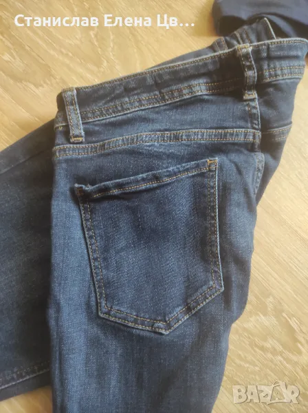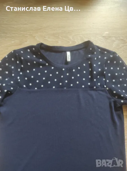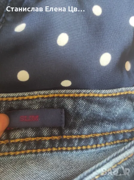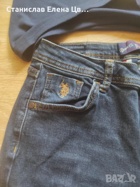 Дамски дънки, еластични, тъмносини на марката U.S.Polo. размер по етикет W38, около размер 26/27 . Към тях блузка от трико нова, отпред материята на частта на точките е прозрачна, другата част е трико. Ръкавите са 7/8.