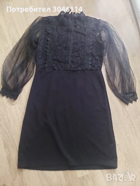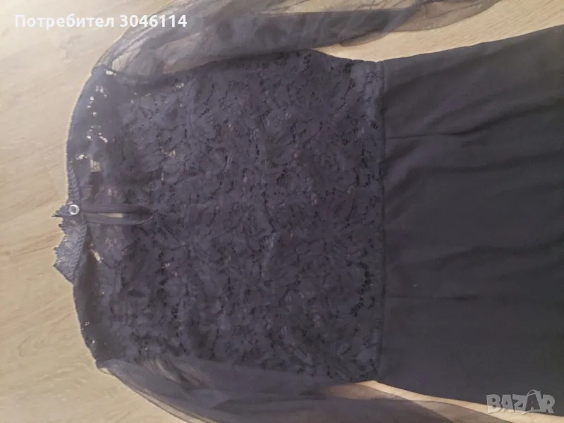 Черна дамска рокла обличана за повод веднъж с тюлени ръкави и дантела надолус прана пола м размер има еластичност гръдна45см талия 40см дълга е 90см