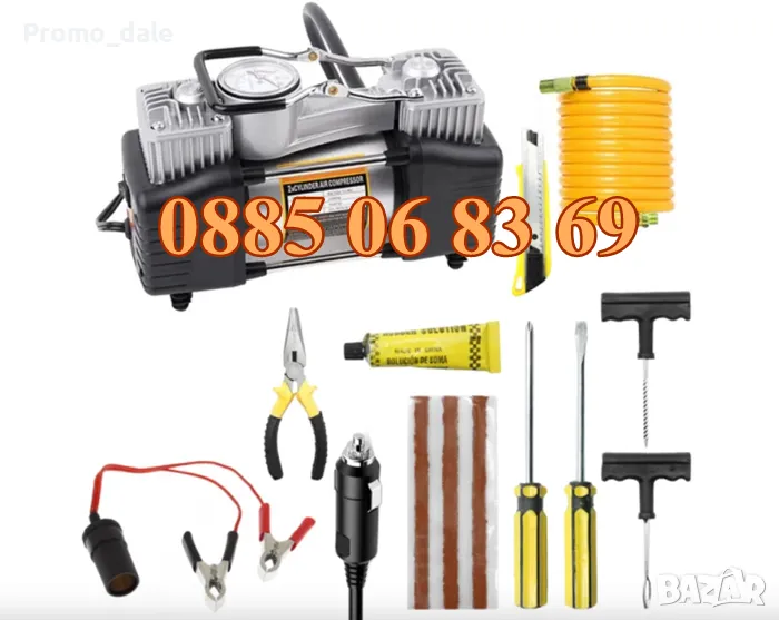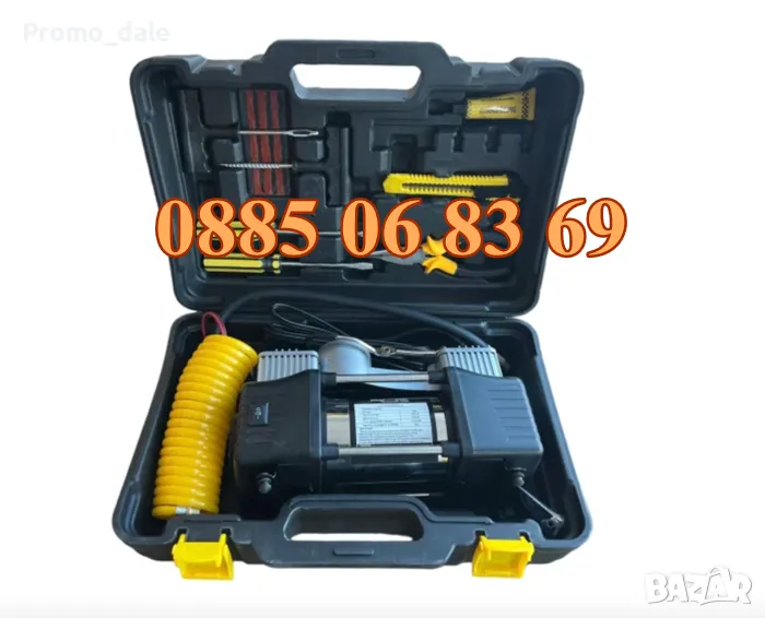 Компресор с изключително здрав метален корпус. Двуцилиндров компресор с манометър и спираловиден маркуч, осигуряващ много бързо помпане на гуми на автомобили и по-тежкотоварни МПС-та, различни надуваеми продукти като лодки, дюшеци, басейни, топки и др.