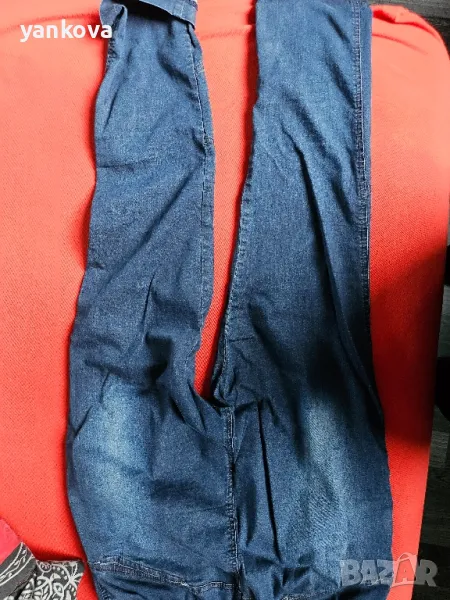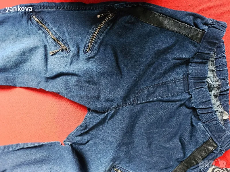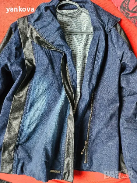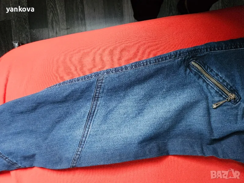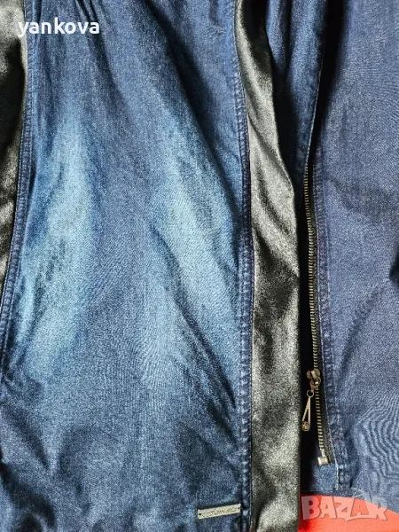дънков,дамски костюм на фирма деним оригинален якето с цип и панталона с ластик на талията. ханш от 90 до 106 см . гръдна на якето около 100 см материя памук и ликра.