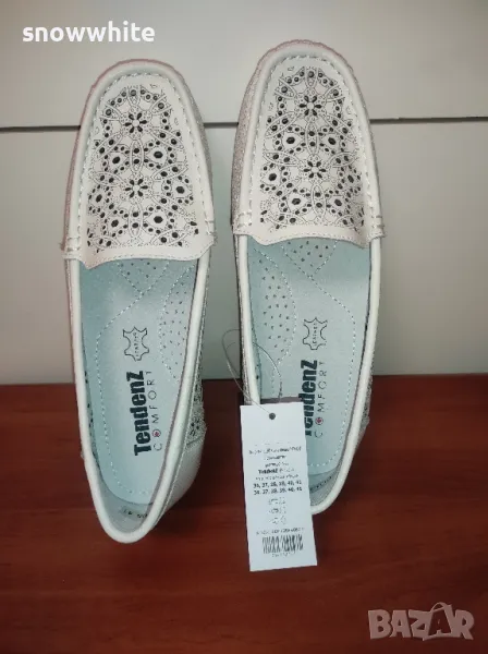 Чисто нови дамски мокасини естествена кожа на Тенденз, размер по етикет 41,но са силно умалени. Дължина на стелката - 24 см. Изпращам с опция преглед и тест,с Еконт или Спиди.