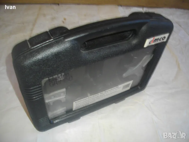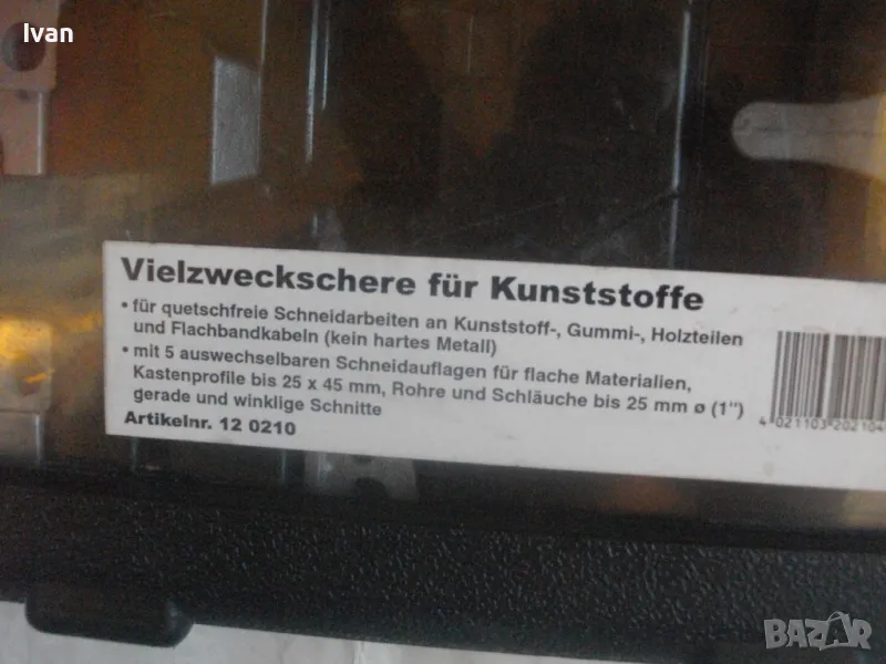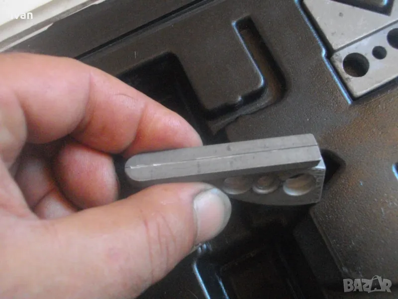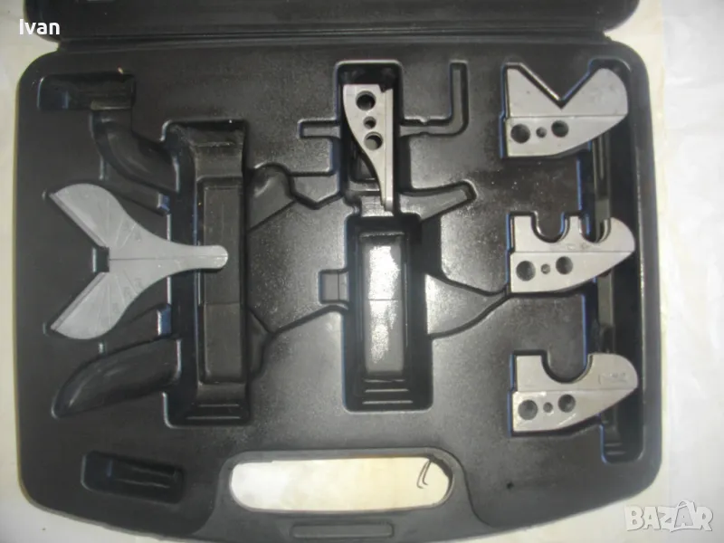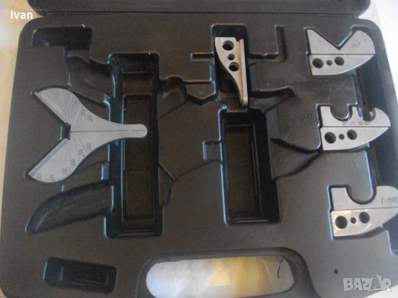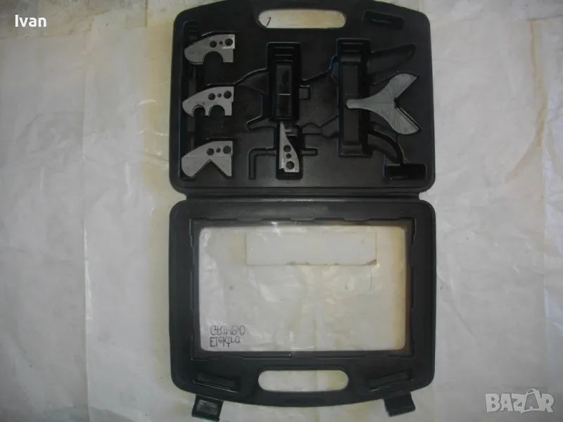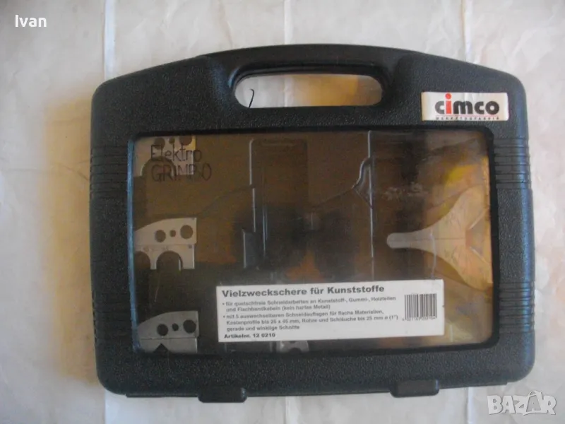 первази - цена на комплекта 129 лв. Съвсев нов, неизползван и неупотребяван. Налични са 5 бр. приставки. Не е налична ножицата. Приставките са за рязане под ъгъл променливо 0-45 градуса, за рязане V рязане 90 градуса, кръгло рязане 3/4 - 19 мм, 5/8 - 16 мм 1 цол - 25 мм. Налична наковалнята от долна страна, която се поставя на ножицата. Марка на компликта - CIMCO - Werkzeugfabrik. Оригинален немски комплект. Куфар пластмаса с дръжка и прозрачно ПВЦ лице. Размери куфар 320 х 265 х 55 мм. Цена на комплектът приставки - 129 лв.