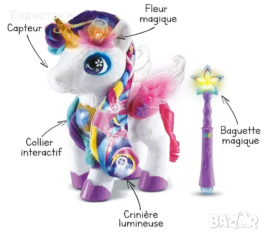 Интерактивна играчка VTech Styla Magic Makeup, плюшен интерактивен еднорог, танцува, пее и променя цвета с магическата пръчка, език: френски.