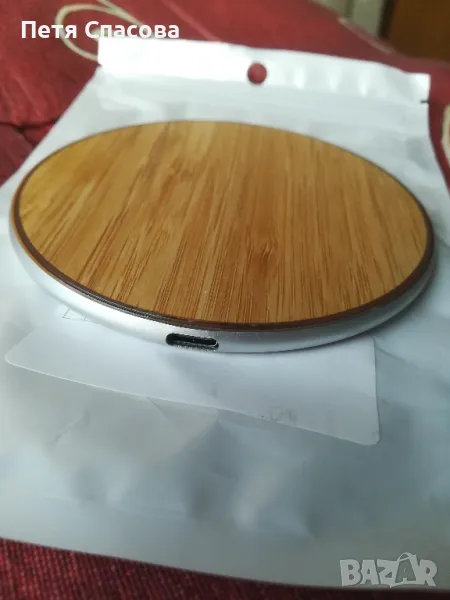Бързо безжично зарядно QC3.0 за телефон изработено от ABS пластмаса имитация на дърво и алуминиева рамка. Вход: Type C