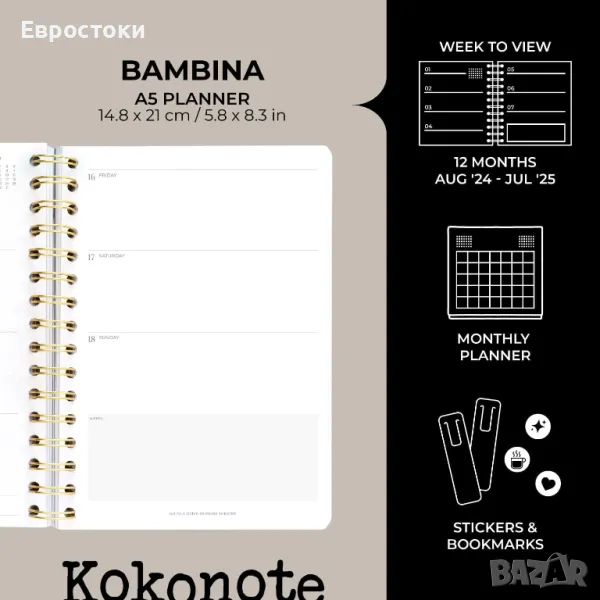 Kokonote Weekly Planner 2024-2025 Dusty Pink 12-месечен академичен дневник - плановик A5. Седмица за преглед от август 2024 - юли 2025. със стикери. Цвят-misty gray.
