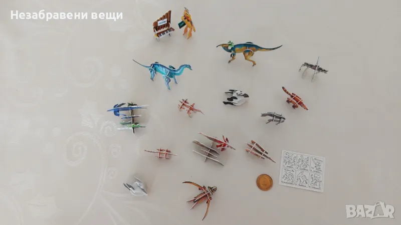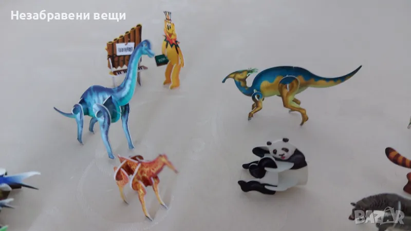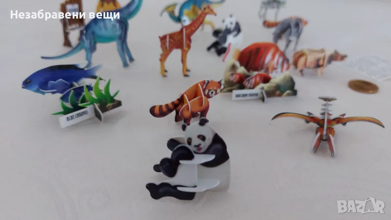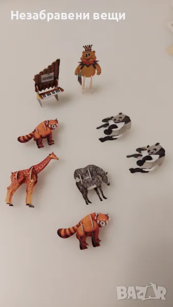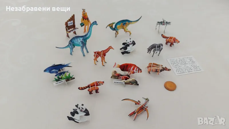 15 миниатюрни сглобяеми фигурки на животни от 90-те години. Двете мечета, едното е още в опаковката си, както и горското пиано, са от Pom-Bar (Pom-Bear), пак от 90-те, а другите са от шоколадови яйца. Изработени са от гланциран картон или тънка пластмаса. Нарочно са снимани до монета от две стотинки, за да се види големината им. Всички са изключително запазени, само на рачето отдолу частично му е наранено покритието, показано е на последната снимка, но отгоре почти не си личи. А на роботчето му липсва едната ръка, затова е подарък.