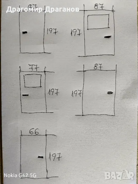 Вътрешни врати без каси .Размерите са показани на сн.3 , като 2 броя са със стъкло , 3 броя са с дясно отваряне, 2 броя - ляво отваряне . Вътрешния размер е с по 1 см по- малко от ляво, отдясно и отгоре ЦЕНА - 350 лв. комплект ЦЕНА -65лв. за брой