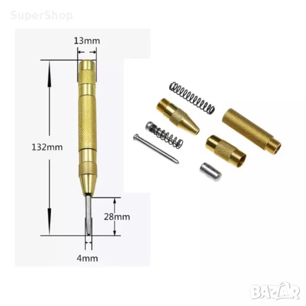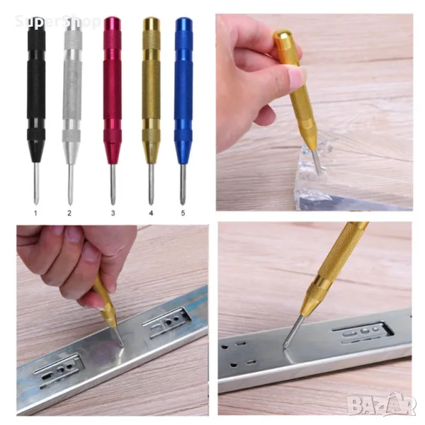 Точкуващият шлосерски център е предназначен за маркиране на металната повърхност чрез пробиване на малки точки върху нея. Продуктът е изработен от висококачествена инструментална стомана и е ориентиран към домашните майстори. Моделът е автоматичен и е с формата на химикалка, но особеността му е че няма ударен край. За да отбележите център не Ви е необходим чук или друг ударен инструмент. Инструментът има вградена пружина в тялото на ръкохватката при притискане на центъра към означаваната повърхност пружината се натяга до определен момент и след преминаване на определено разстояние тя се освобождава и експлозивно нанася удар с върха на центъра върху повърхността на материала.