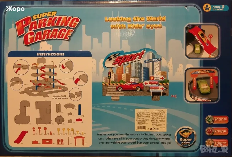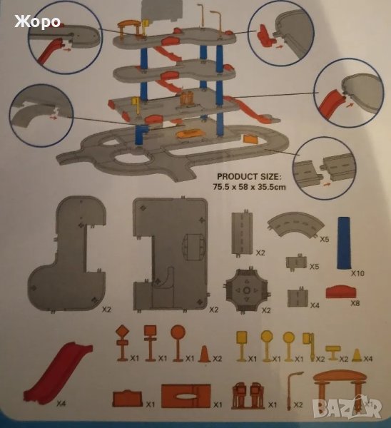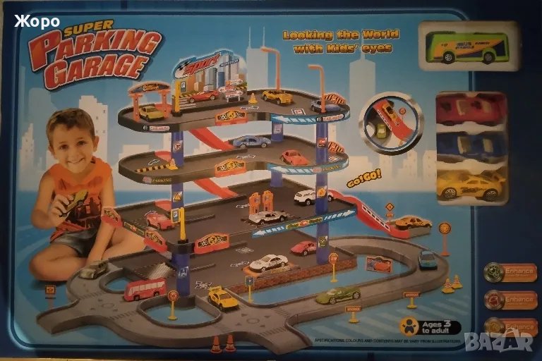 Паркинга се състой от 4-етажна лесно разглобяема голяма писта или паркинг с автомивка. Играчката разполага се три автомобила и автобус , която поотделно или в комбинация с други играчки и коли увеличава креативността и координация на детето и забавлява и занимава го часове на ред
