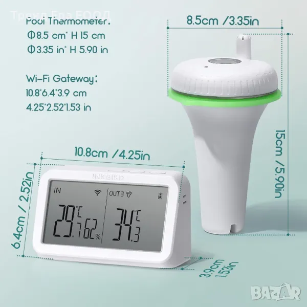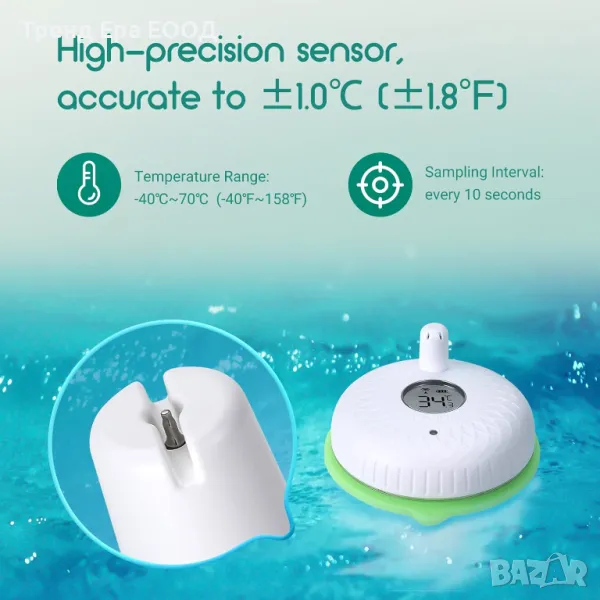 С този WiFi комплект термометър за басейн можем да сме в крак с температурата в реално време навреме и да се насладим на прекрасно плуване при оптимална температура. В допълнение към плувните басейни, той е подходящ и за използване в горещи вани, спа центрове, къпане, рибни езера, аквариуми и др.