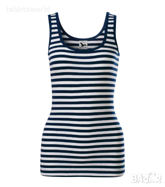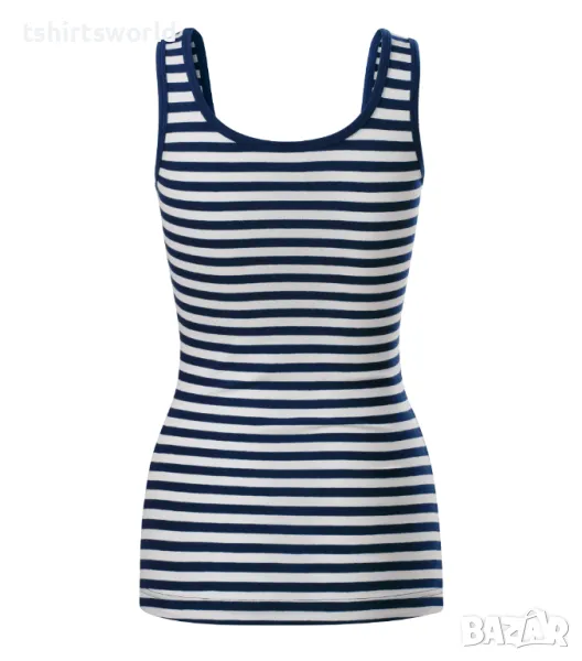 Страхотен нов дамски моряшки потник на тъмносиньо и бяло райе(navy blue), произведен под марката MALFINI, изработен от висококачествен 95% памук и 5% еластан на 180g/m² с обло деколте. Подходяща за носене както в горещите летни дни навън, така и вкъщи пред телевизора. Материята не позволява да се измачка, което го прави изключително ценен и желан от нашите дългогодишни клиентки. Потникът може да се пере при температура до 30 градуса. Спокойно можем да гарантираме за качеството на изработката и ярките цветове на дизайна.