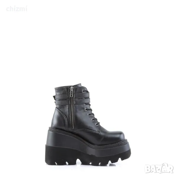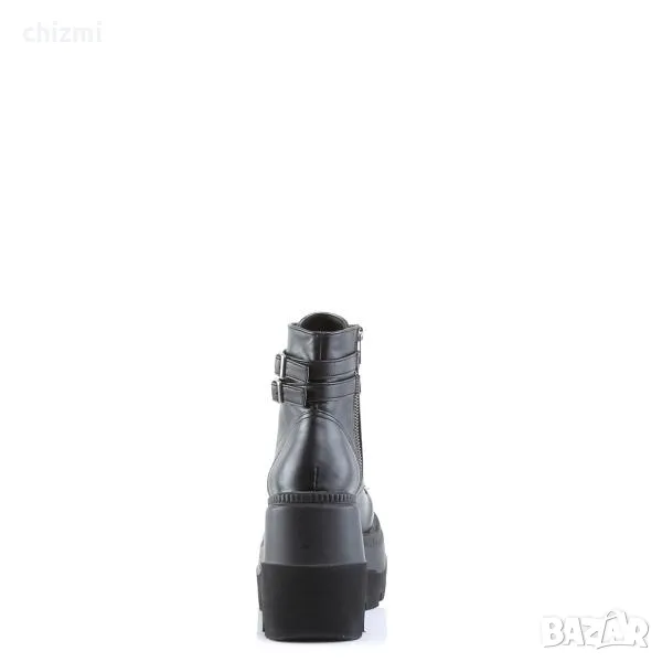 Shaker-52 са типичните боти до глезена на Demonia. Включващи дръзка 4,5-инчова подредена платформа на клин, която ще издигне всяко облекло от обикновено до необикновено. Поразителната черна веган кожа добавя остър щрих към вашия външен вид, докато предната част с връзки и двойните каишки на глезена осигуряват сигурно и удобно прилягане. пълното затваряне с цип от вътрешната страна гарантира лекота на носене, докато емблематичният дизайн ще накара главите да се обръщат с всяка стъпка.Независимо дали отивате в клуба или се обличате за специален повод, Shaker-52 е перфектният избор за всеки, който иска да направи дръзко изявление с техните обувки Пригответе се да стъпите и да блеснете в тези незабравими и универсални боти.