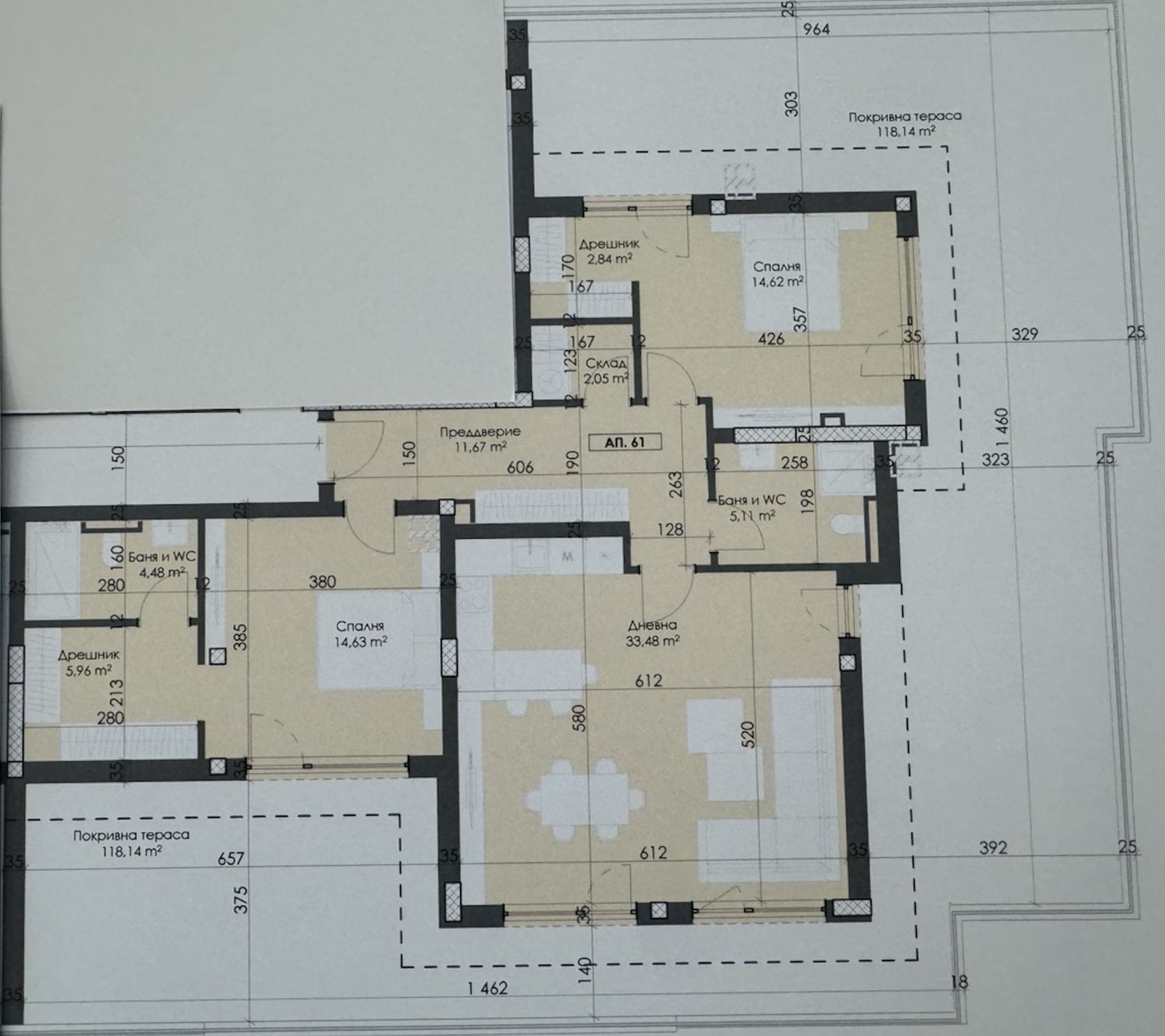 Представеният апартамент се състои от просторна дневна, 2 спални, 2 бани с тоалетна, склад, предверие и покривна тераса с изкушаваща гледка.