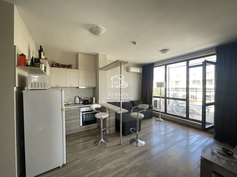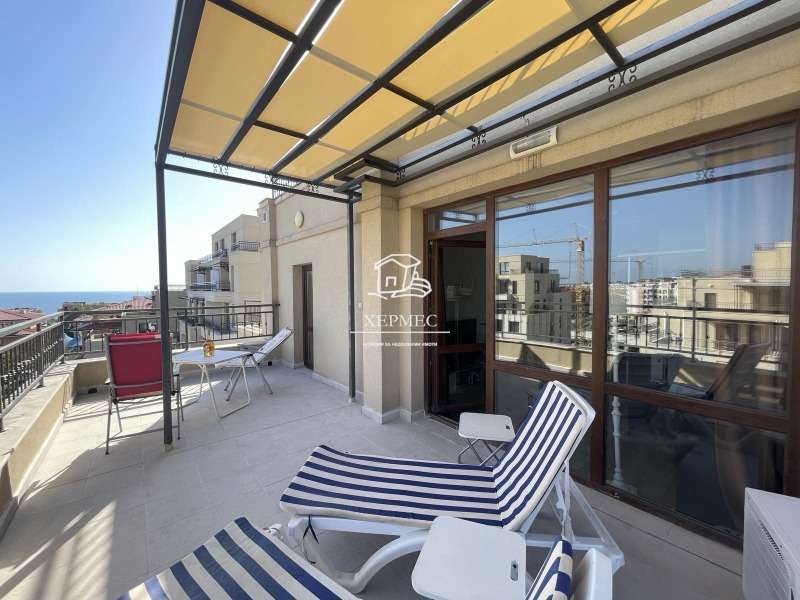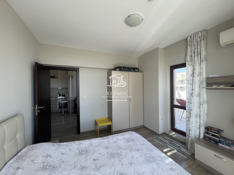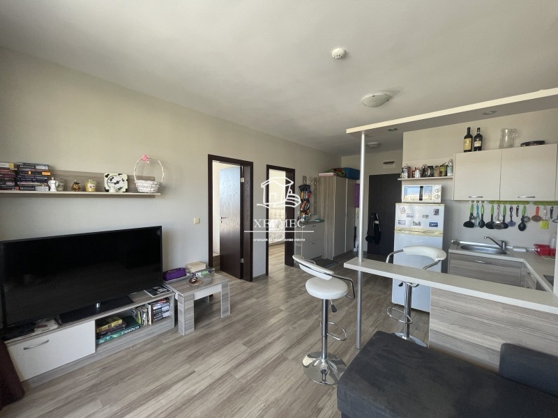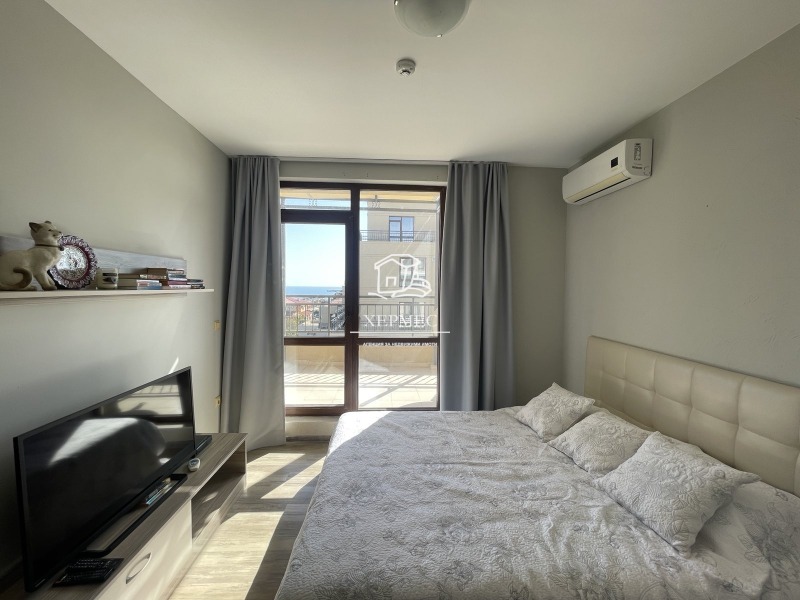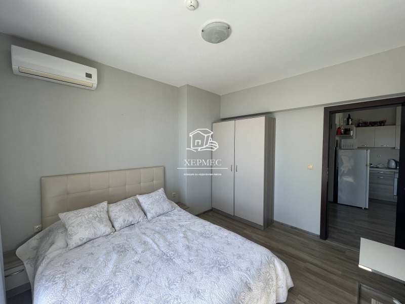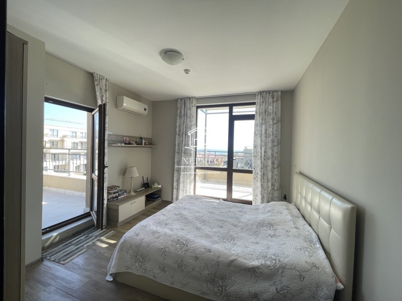 🔑Апартаментът представлява входно антре, просторна и слънчева всекидневна с кухненски бокс с малък бар плот и, баня с тоалетна, две спални и две тераса с гледка към морето и Стара планина. Продава се напълно обзаведен и оборудван: нова кухня с ел. уреди -печка с керамичен плот и фурна, аспиратор, хладилник, 3 климатика. И двете спални са оборудвани с двойни легла с ортопедични матраци и гардероби.