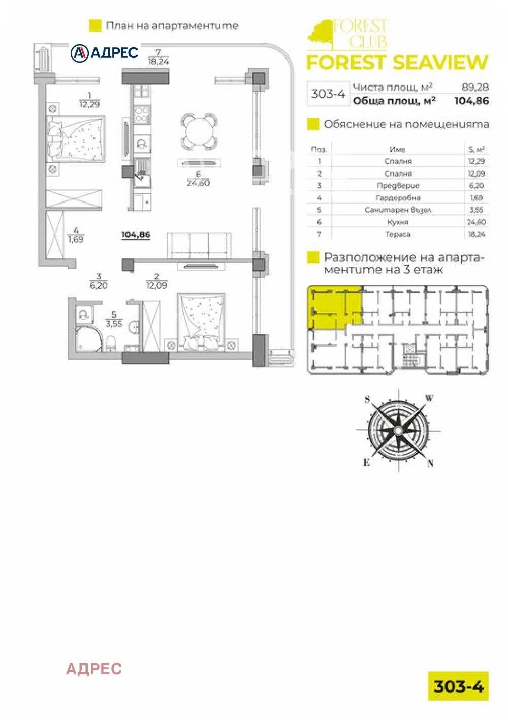 Тристаен тухлен апартамент в сграда в строеж. Жилището се състои от просторна дневна с кухненски бокс, две спални, баня с тоалет, килер, входно антре и тераса. Forest SeaView е жилищен комплекс от 5-етажни сгради, разположен на 15 минути от най-добрите плажове на Варна. Апартаментите в комплекса, ще бъдат с морска и горска панорама.