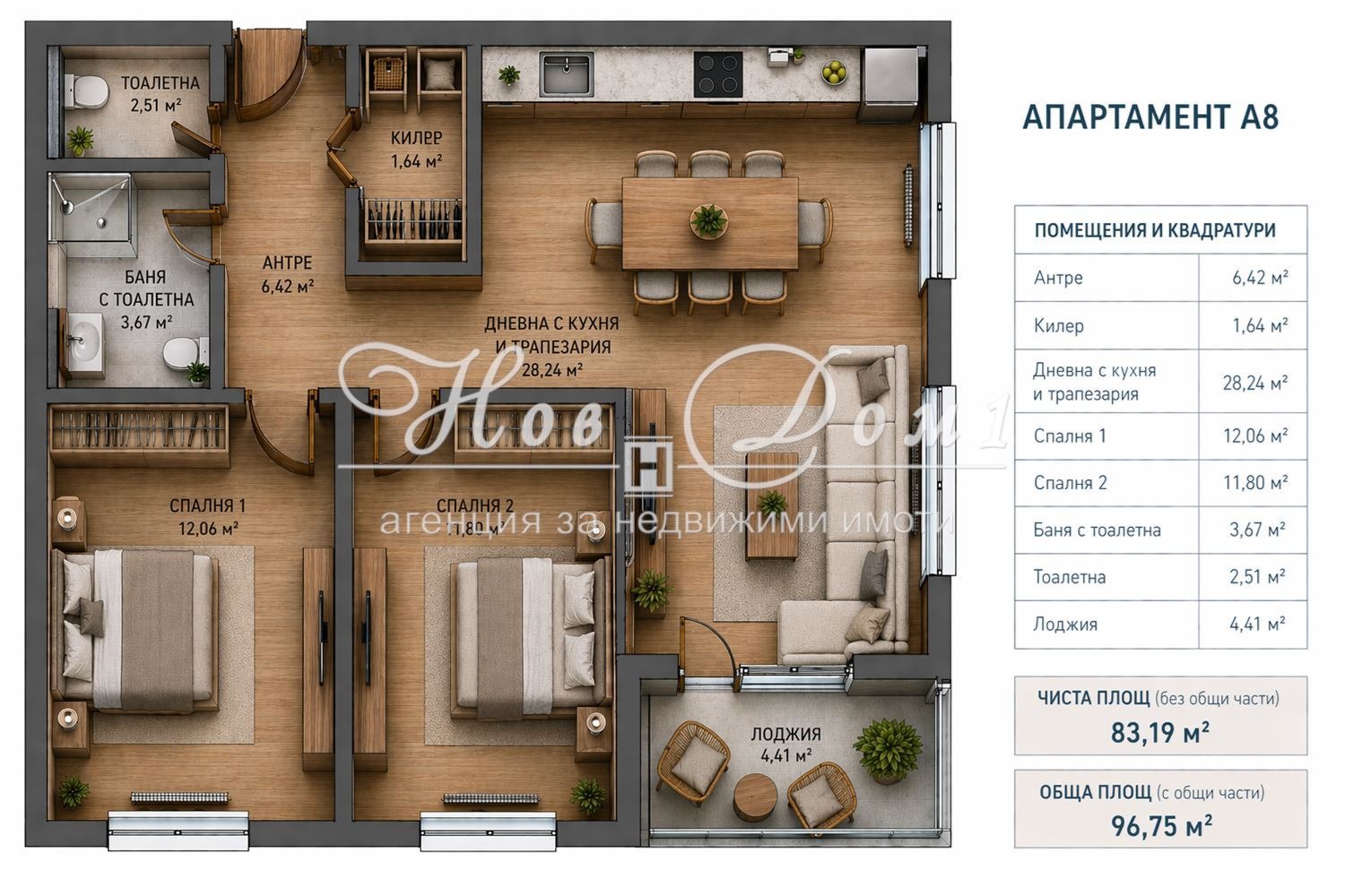 Апартаментът представлява: входно Антре, просторна и светла Всекидневна + Кухненски бокс + Трапезария около 28м2 с изход към Тераса тип 'Лоджия' около 4,45м2, две непреходни спални с правилни форми по около 12м2 всяка, Баня + Тоалетна около 4м2, отделно втора Тоалетна, Килер/Перално.