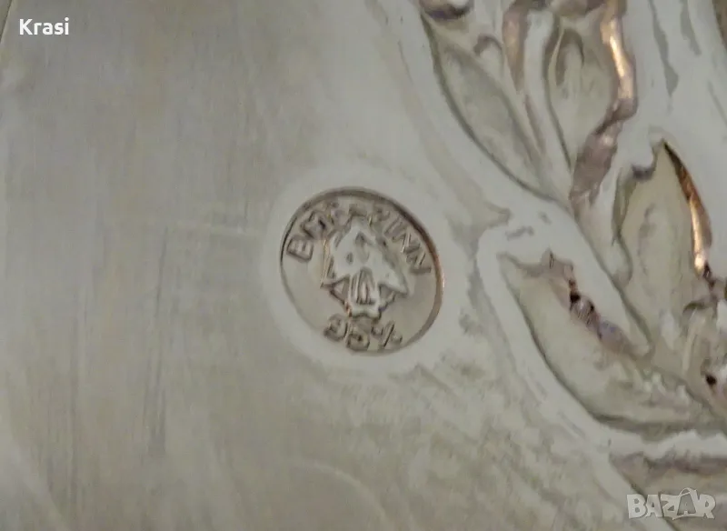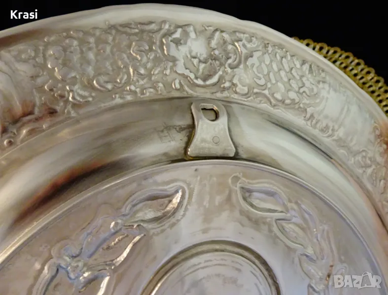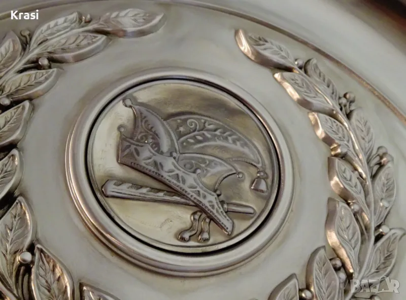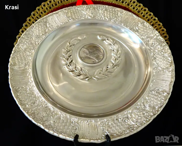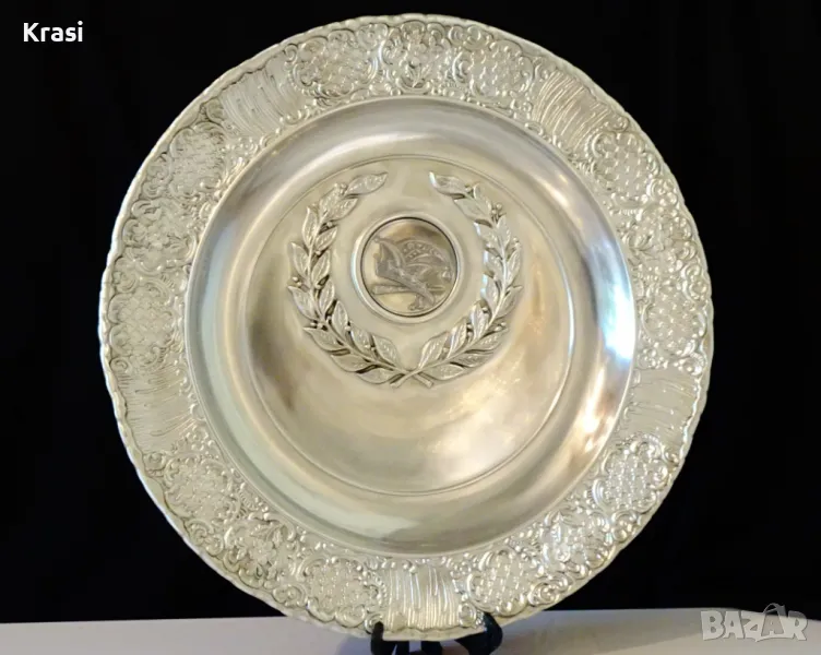 Западно германско калаено пано,чиния за стена,майсторска ръчна изработка от 95% калай и 5% сребро на BMF,маркирано със запазена оригинална опаковка на производителя.Паното е предназначено за 10 годишнина от сватба,калаена сватба.В центъра е релефно декорирано с кралска корона,жезъл и лавров венец.Под тях има място за гравиране на пожелание или послание.Периферията на паното е декорирана с разкошни релефни цветя и орнаменти в стил барок.Има стабилна окачалка за стена.Незабравим подарък за вечен спомен от щастливото събитие.Диаметър 31 см.,височина 3 см.,тегло 1 кг.