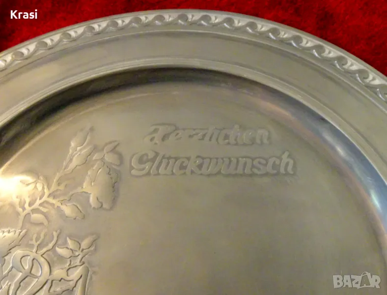 Старинно немско калаено пано,чиния за стена,майсторска ръчна изработка от 95% калай и 5% сребро,маркирано от производителя.В центъра има релефен букет цветя и надпис "Честито".Под него е оставено свободно място за гравиране на поздрав,пожелание,послание.Периферията е декорирана с красив релефен орнамент.Паното е произведено с по-тъмен фон за да може гравираният поздрав да блесне.Има стабилна окачалка за стена.Перфектен подарък за калаена сватба,рожден ден,юбилей.Диаметър 23 см.,височина 1 см.,тегло 620 гр.