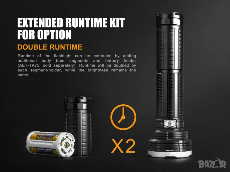 Удължителят за Fenix TK75 е в комплект с оригинален държач за батерии.