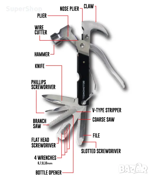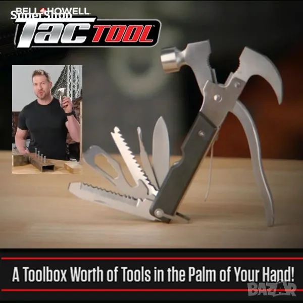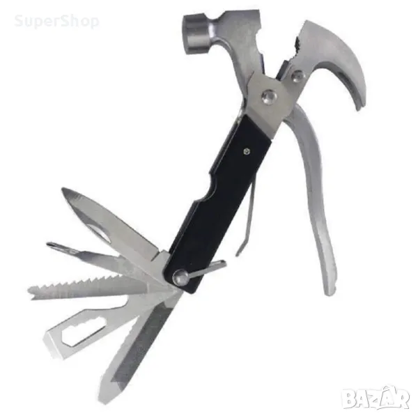 Мултифункционалните инструменти са изключително подходящ избор за дребни ремонти у дома. Моделът, който ви представяме е незаменим помощник за всеки любител майстор или при спешна нужда от няколко инструмента под ръка в гаража, колата, на къмпинг, излет и т.н. Благодарение на него ще имате кози крак, клещи, клещи за рязане на кабели, чук, нож, кръстата отвертка, трион, отвертка с плоска глава, 4 ключа (6, 7, 8 и 10 мм), отварачка, обикновена отвертка, пила, трион, тесла и други. Разполага с удобна ръкохватка и изненадващо компактни размери.