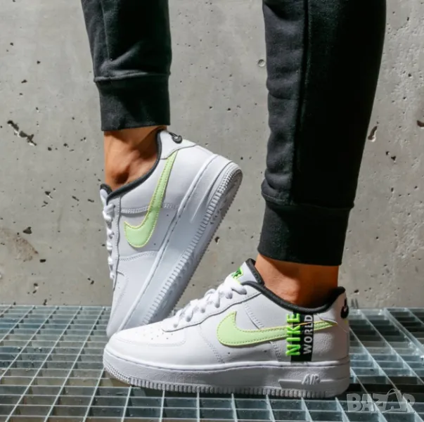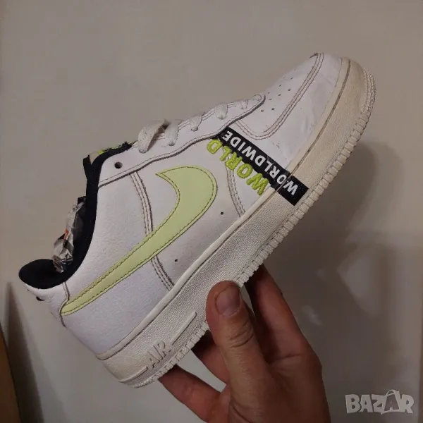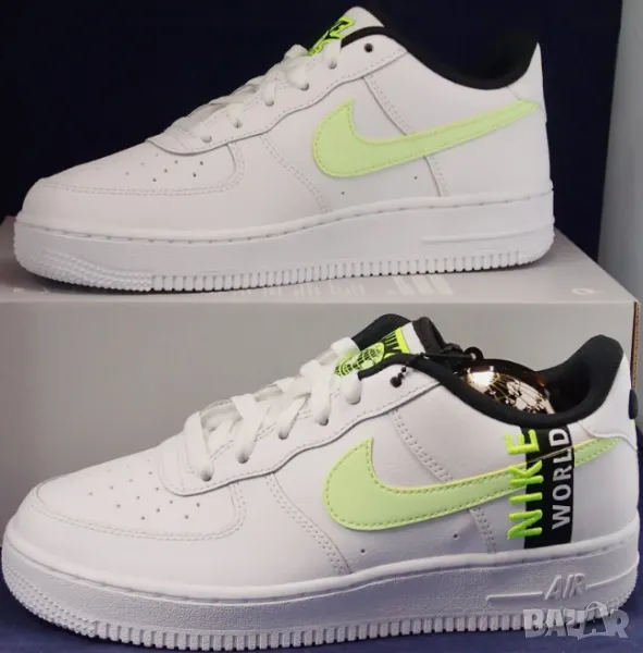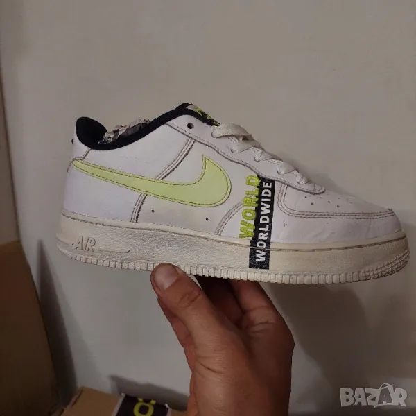 Nike GS Air Force 1 Low "Worldwide White Barely Volt"Малко използвани , с минимални следи , без забележки Красиви , модерни , Класически модел Air Force. Изработен от висококачествена естествена бяла кожа, осигуряваща комфорт при ежедневна употреба. Моделът работи перфектно по всяко време на годината и се поддържа изключително лесно. Високата кройка предпазва допълнително глезена. Обувки с връзк