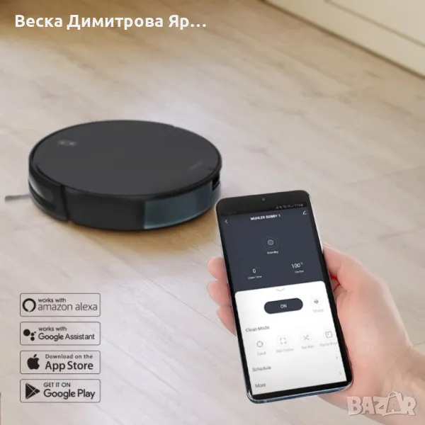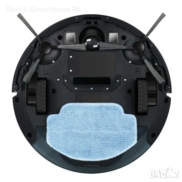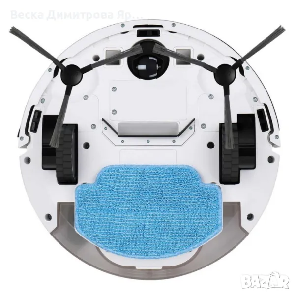 Безчетков мотор с мощност на засмукване 1400 Pa;200 ml Контейнер за прах;230 ml Воден контейнер с електронен контрол на водния поток;Приложение: TuyaSmart;2 нива на мощност: Стандартно и силно;Амазон Алекса и Гугъл асистентиФункция “График”: За настройване на час за стартиране на почистване;Скорост на движение : 0.3 m/s;Преодоляване на препятствия до: 15 mm.;Ниво на шума: ≤ 65 dB;Изходящ ток: 19.0 V/0.6 A;Батерия: 2500 mAh;Работен температурен диапазон / Влажност: 0 - 40°C / 85 %;Мощност: 28W;Зареждане около: 5h;Работа с едно зареждане около: 100 min;Нето тегло: 2.5 kg.;Размери: Φ30*7.4 cm.;Четки: 2 броя лява и дясна;Цвят: Бял, черен;Гаранция: 24 месеца.Допълнителните аксесоари включват:-Моп за