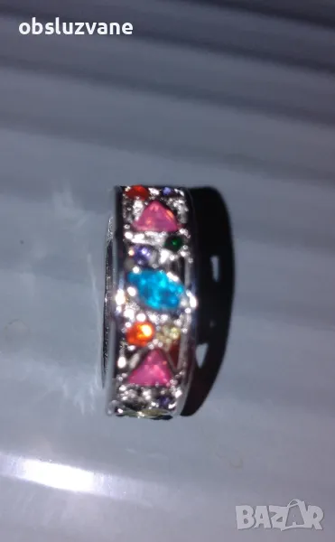 Моден искрящ и в покритие от сребро дизайнерски пръстен -халка с големи разноцветни кристали в различни форми.