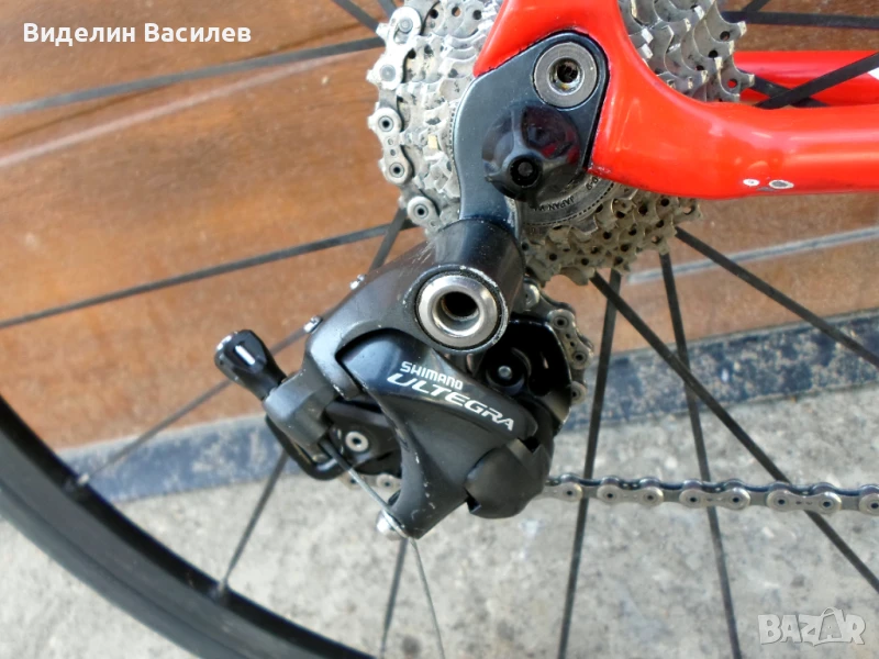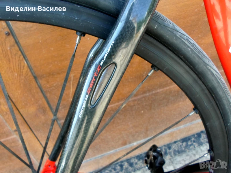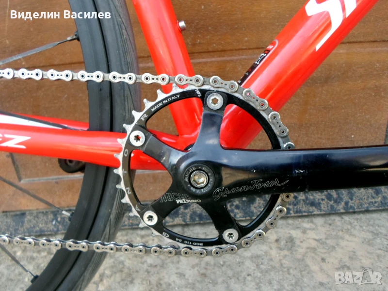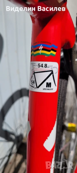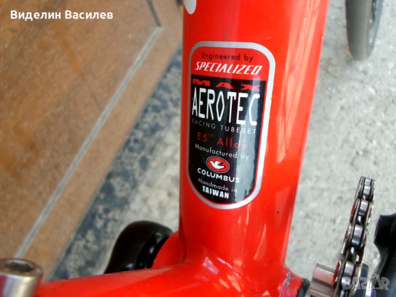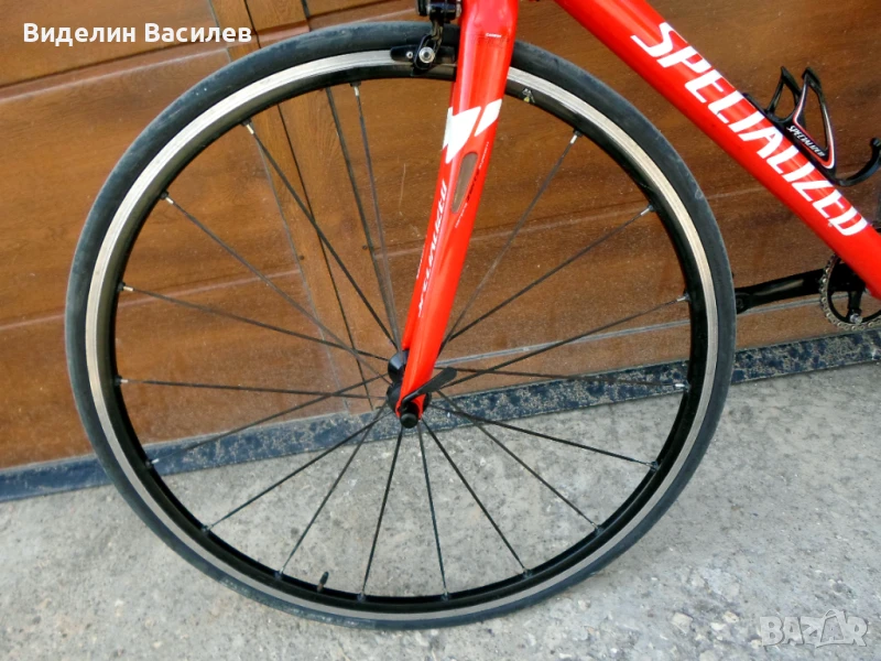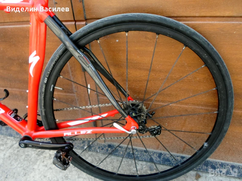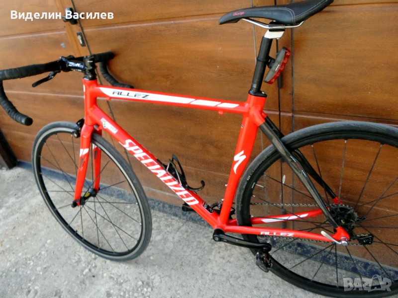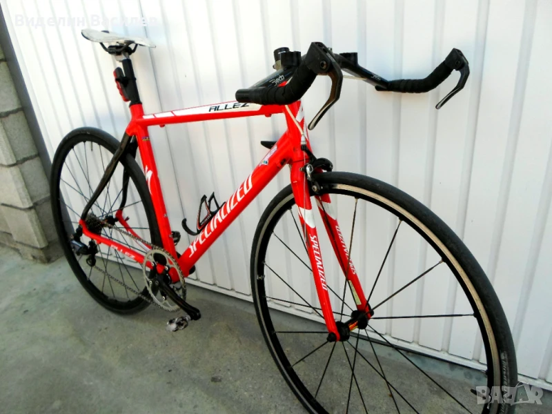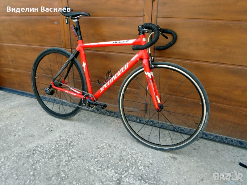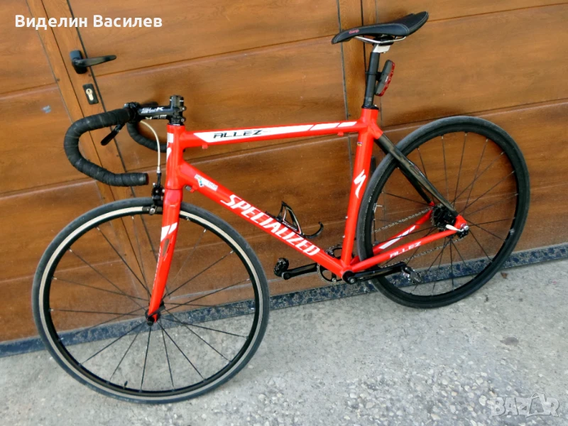 Рамката има пукнатина/поне аз така си мисля/и съм я наредил с излишни мои части като градски сингъл .Specialized Allez Pro ,M размер/на снимките е с височина седло 74 см/,Zertz System предна и задна карбонови вилки. Някой ако иска рамката договаряне/ЛС/,вилка 140 лв/с пеперуда и карбо спейсъри, челото на рамата е 17 см/. Капли Mavic Ksyrium Elite,предна отлична/90 лв/, задната е с износен борд/50 лв/. Курбели компакт Miche Primato /70 лв/ ,SPD Shimano M525 35 лв/с парчета/,Ultegra 6800 заден дерайльор /90 лв/