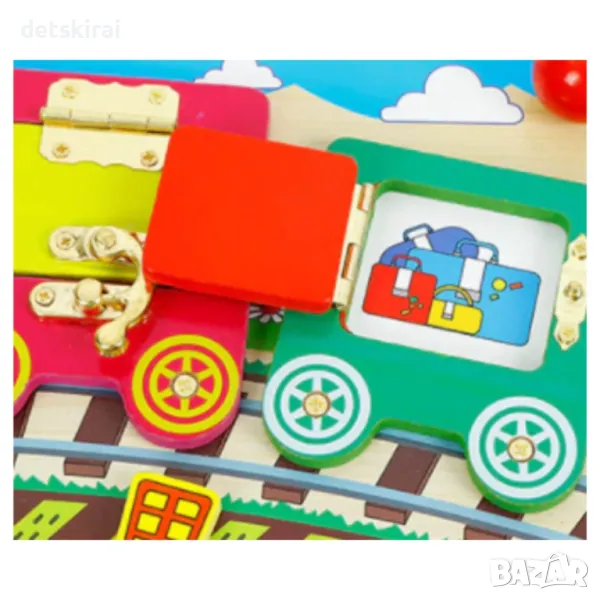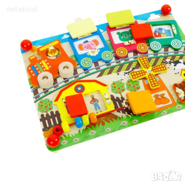 - Влак с 3 вагона с дървена дограма и локомотив със звънец. Детето трябва да отвори прозорците, за да открие кои животни се крият зад тях;