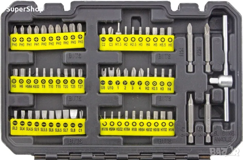 - 60 бр bit къси: PH, PZ, TORX, HEX, HEX SAE, HEX, SL, C