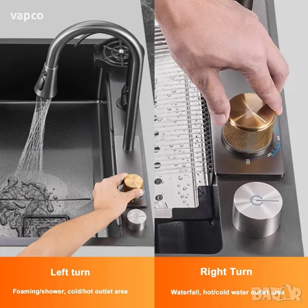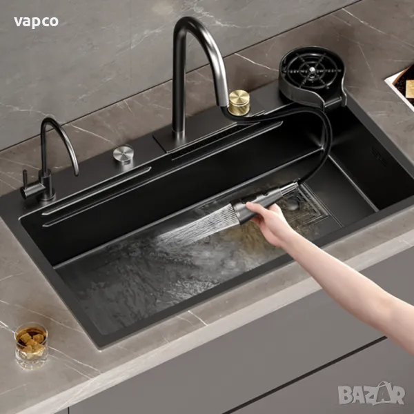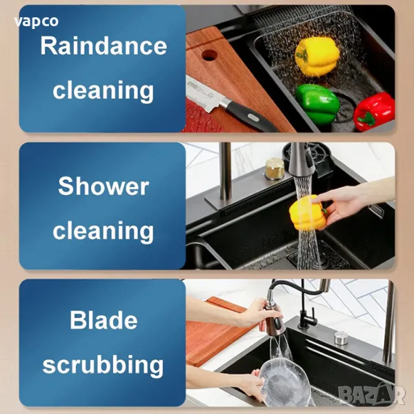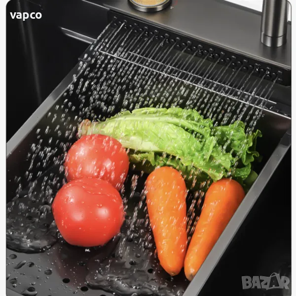 Висококачествена мултифункционална мивка от неръждаема стомана. Създава многофункционално работно пространство, за да можете удобно да миете плодове и зеленчуци с нейния