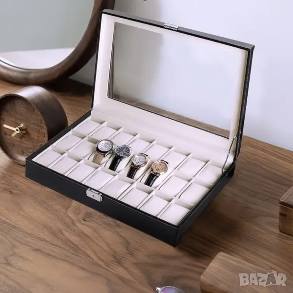 голяма кутия за 24 броя часовници от екокожа с прозорец ,