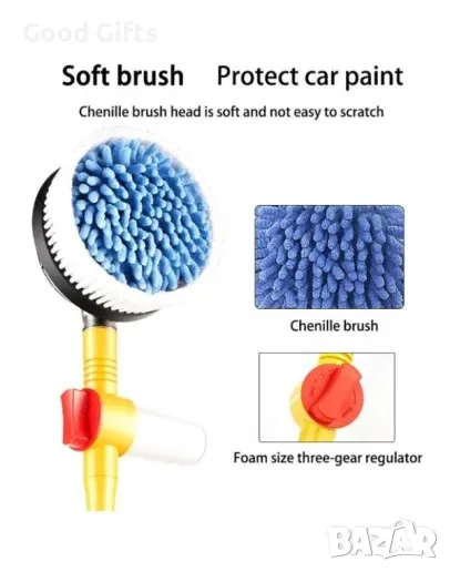Също така, можете да махнете самата четка и да използвате накрайника като изпускате струя вода. Така ще можете да почистите всички трудно достъпни места, като фаровете, разстоянията между вратите, гумите и други подобни.
