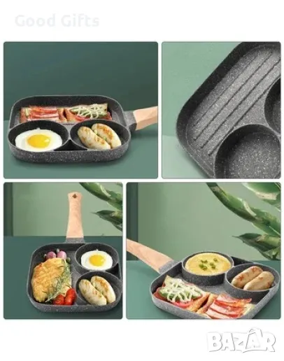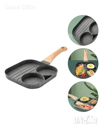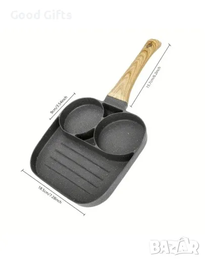Тиган за 2 броя яйца на очи и оребрено отделение за печене на месо или кюфтета, подходящи за бургери. Тигана е с незалепващо покритие с три отделения, форма за печене или пържене, със сваляща се дръжка.