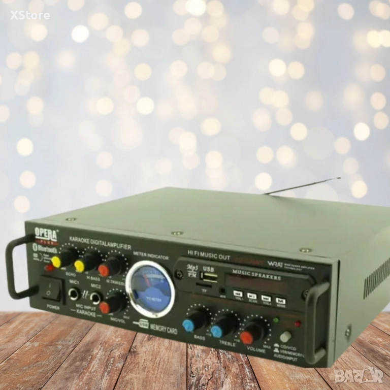 Тип продукт : Аудио усилвател;Караоке Аудио Домашен усилвател UKC AV-339A + BLUETOOTH е компактен и мощен усилвател, подходящ за домашно забавление и караоке. Поддържа Bluetooth свързаност, което позволява лесно свързване с мобилни устройства и възпроизвеждане на музика безжично. Усилвателят разполага с два микрофонни входа, регулиране на ехо, бас и високи честоти, което осигурява качествен звук и ефекти за пеене;Основни характеристики:Мощност: 2 x 100W;Свързаност: Bluetooth, RCA входове, USB, SD карта;Честотен диапазон: 20Hz – 20kHz;Микрофонни входове: 2, с контрол на звука и ехо ефект;Дистанционно управление: Включено;Функции: Радио FM, възпроизвеждане от USB/SD, AUX вход;Гаранция 12 месеца.