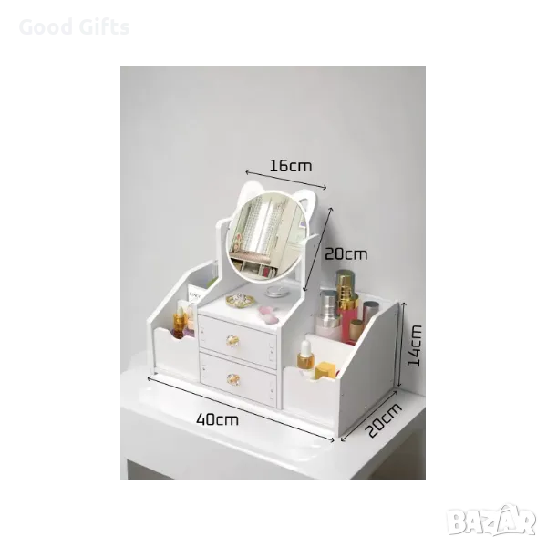 Огледалото с форма на котешки уши придава уникален и стилен вид на органайзера. 4 отделения и 2 чекмеджета осигуряват достатъчно място за различни козметични продукти и аксесоари. Водоустойчив дизайн, предпазва съдържанието от влага, което го прави подходящ за употреба в банята. Чекмеджетата се плъзгат плавно, което улеснява достъпа до всичко необходимо. Материал от ABS пластмаса, здрав и устойчив на износване материал, който осигурява дълготрайна употреба.