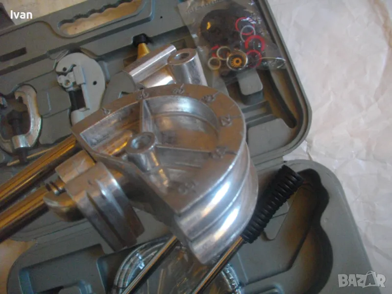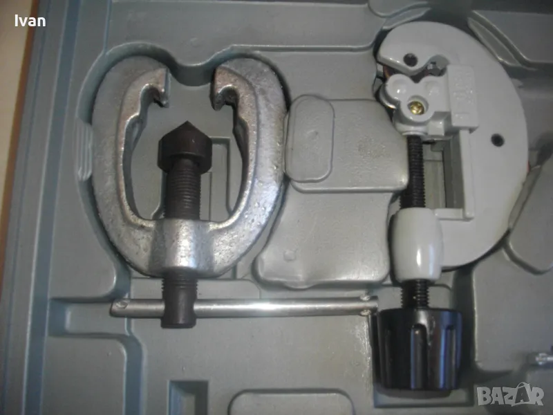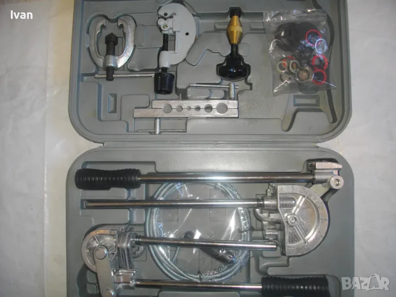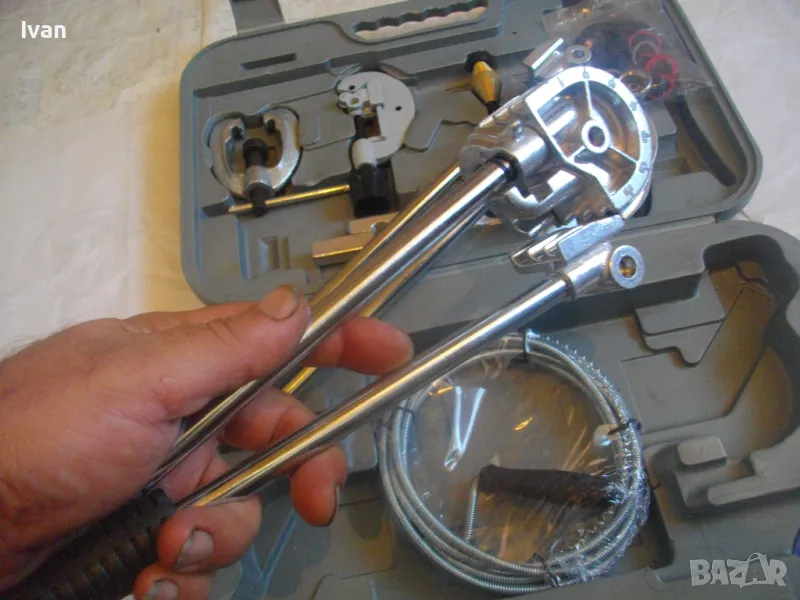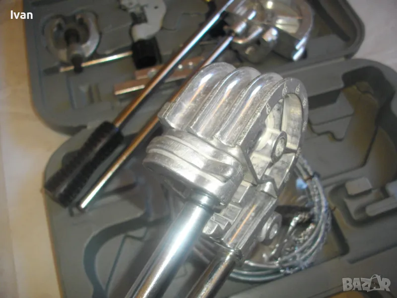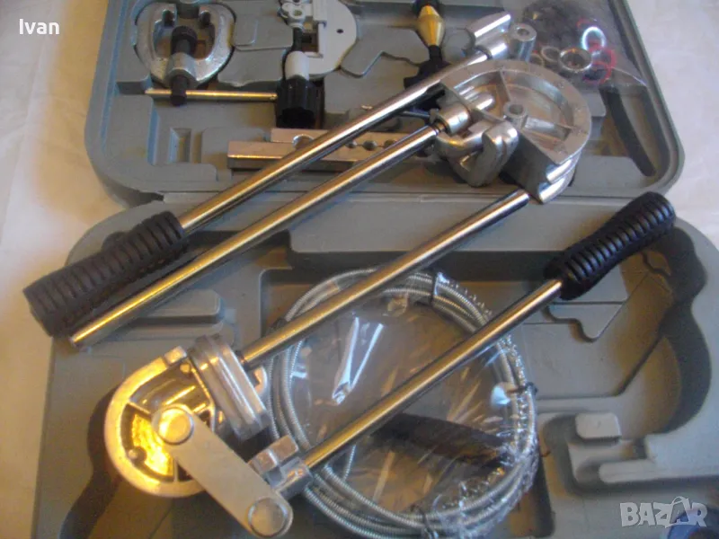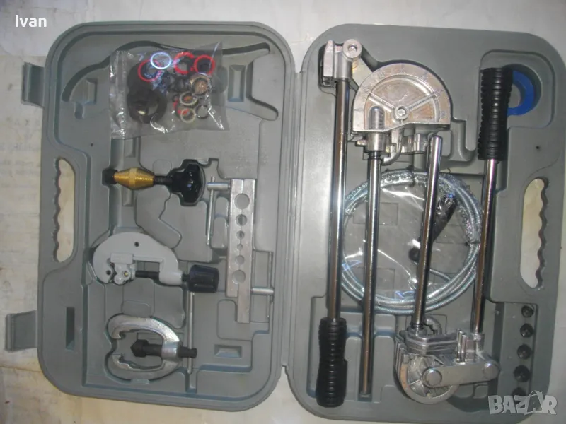 ОПИСАНИЕ на куфар сив нов комплект ръчни инструменти за ремонт на тръбни инсталации и водопреносна водопроводна мрежа - цена 155,00 евро/ 303,15 лв. Съвсем нов комплект, предполагам немско производство. Комплектът включва ръчни инструмнти: