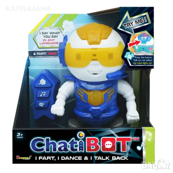Чатибот може да пръцка по много различни начини, което го прави изключително забавен. Има и три различни мелодии, на които танцува. Виж го как се движи! Натисни бутона и му кажи нещо - той ще повтаря след теб със своя роботски глас. И отново е време за пръцкане!