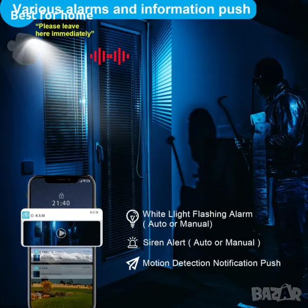 Когато безжичната wifi камера за наблюдение открие движещ се обект или човек, тя задейства аларма и светва, за да изплаши подозрителни хора.