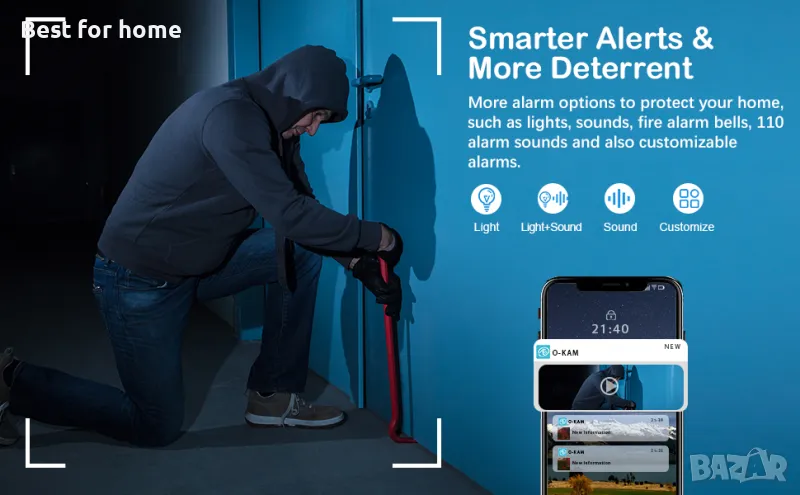 Множество опции за аларма за защита на вашия дом, като светлини, звуци, тонове за пожарна аларма, звуци на 110 аларми... и също персонализируеми аларми.