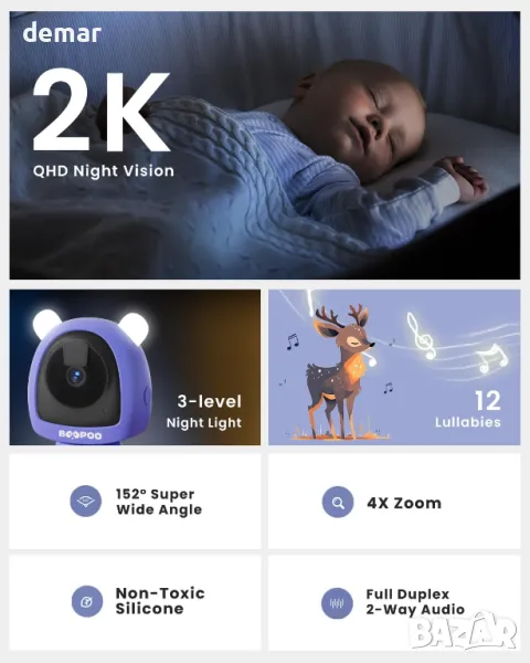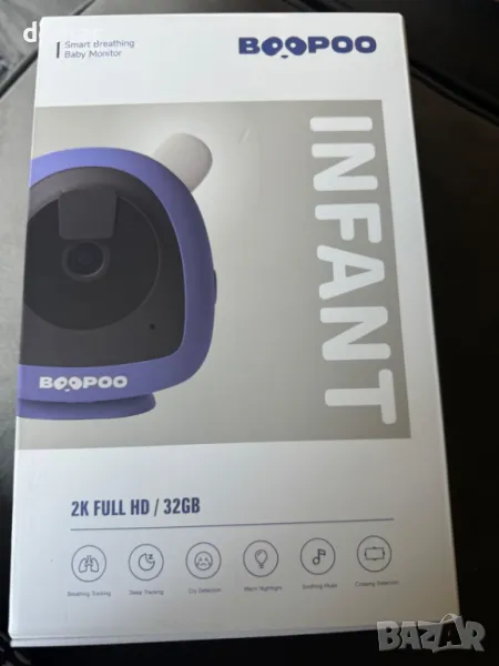 BOOPOO Smart Baby Monitor 2K, нощно виждане,откриване на плач,2.4/5GHz