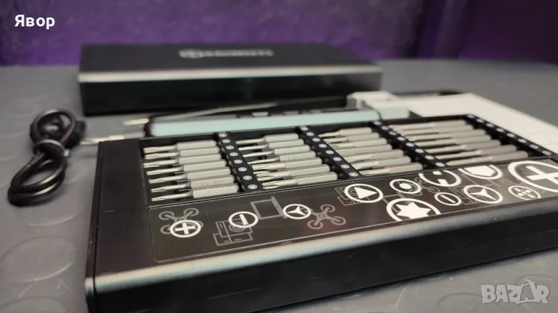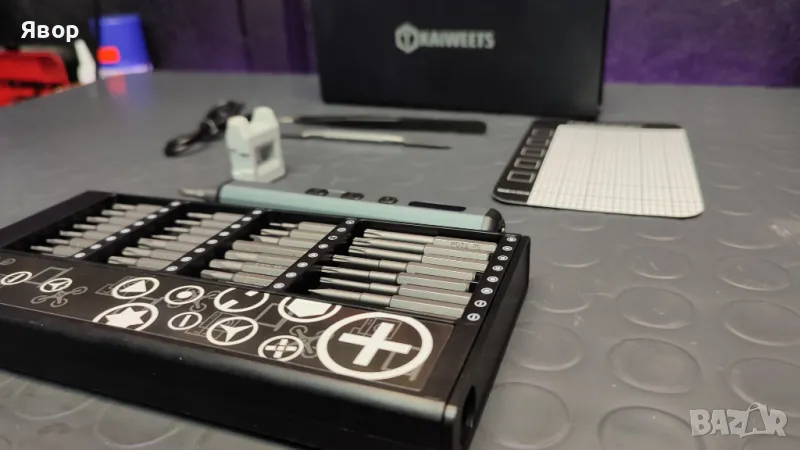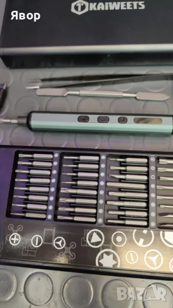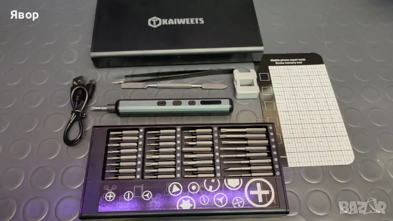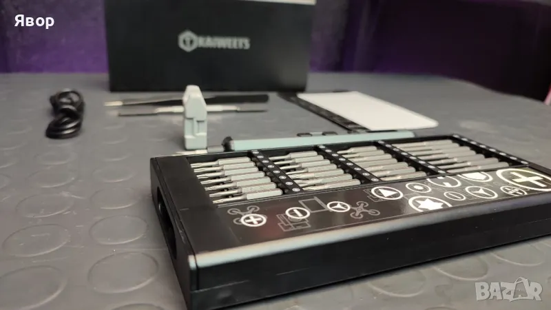 Супер прецизен комплект от марката KAIWEETS с инструменти за фина механика и електрическа отвертка с регулиране на скоростта и силата на завиване.