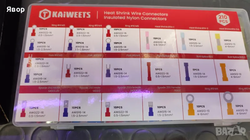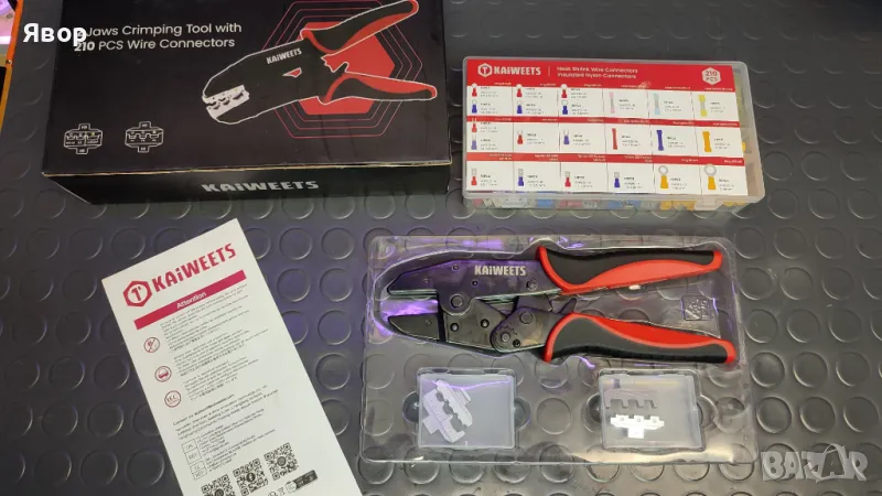 Комплект качествени кримпващи клещи на марката KAIWEETS в комплект със сменяеми челюсти и 210 кабелни обувки и кримпващи части.