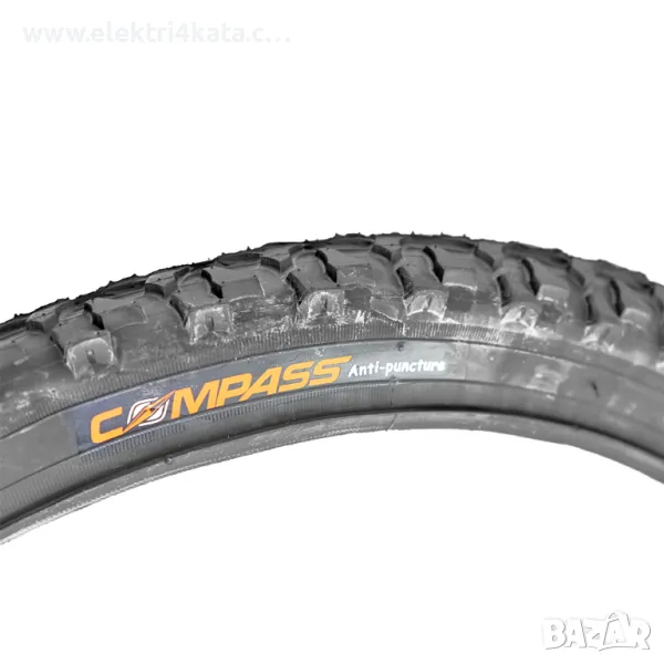 Външна гума 24х1.95 с защита от спукване COMPASS са оборудвани с технология Anti Puncture, осигуряваща защита от спукване. Те имат вграден 4 мм слой от патентован, гумиран, полифибърен материал между протектора и корпуса, предотвратяващ проникването на остри предмети като бабини зъби, видии и пирони.