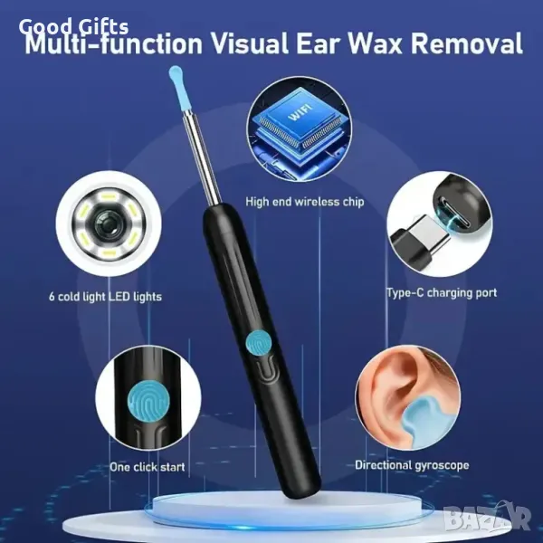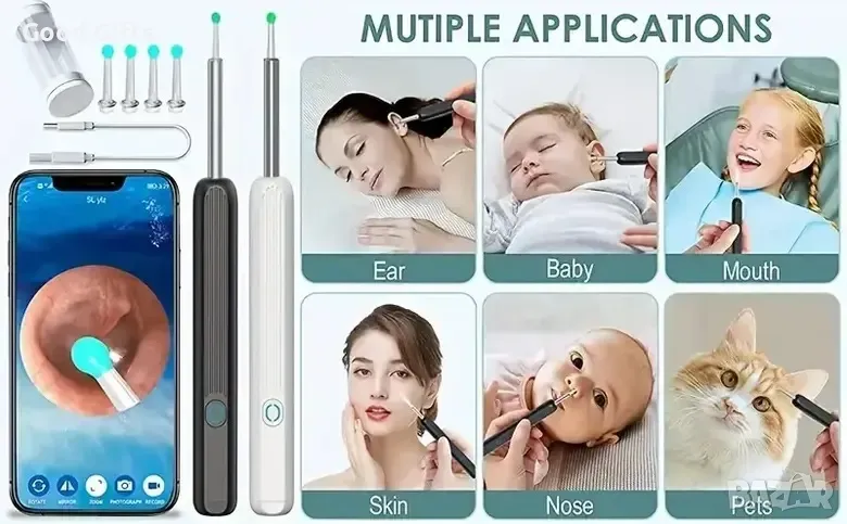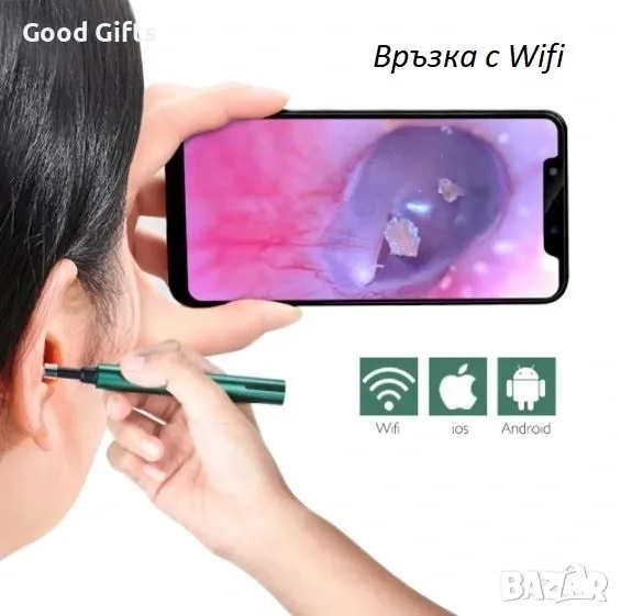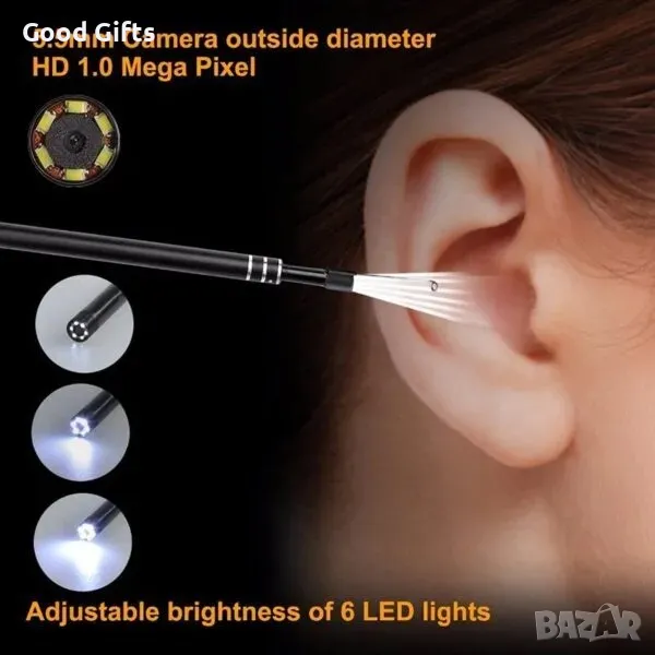 Мултифункционален инструмент за преглед и деликатно почистване на уши. 3-мегапикселова HD камера, 6 LED светлини, WiFi връзка и свързване с телефон.